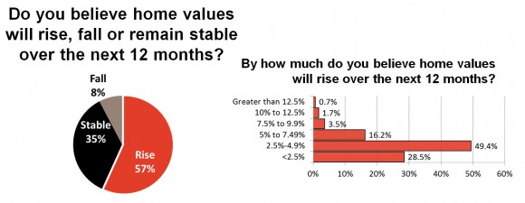 大多数人认为澳大利亚房价在接下来的一年里会上涨(57%)。相比去年10月只有47%的人报此观念。