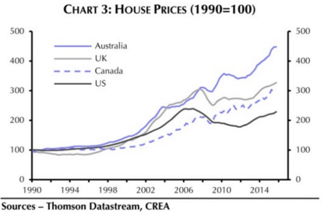 Dales强调,澳洲房地产市场比美国在全球金融危机之前看起来更容易大幅降价。“从1990年来澳洲房价上升了350%,比美国在泡沫破灭前的140%要多得多。按照某些标准,澳洲房价至少跟美国房市最繁荣的时候被高估的一样多。”