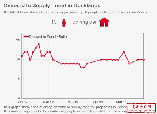 根据最新的报告,在墨尔本Docklands区,每一处物业每天约会有10位客户来看房,图1为2010年-2011年每处物业平均看房人员数量统计,在这几年中,此数值一直保持相对稳定。虽然此数值相当可观,但是墨尔本的物业近期一直处于供大于求的状态中,见图2。