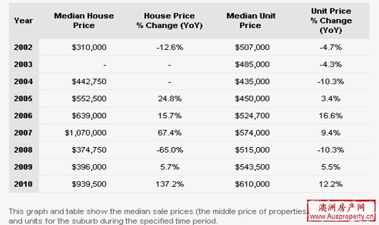 下面我们再看下近几年别墅和公寓中位价的变化情况,如图3所示,相比稳定的公寓价格变化,别墅的价格在近几年呈现出更快更大程度的增长,其增值的空间已经明显超过了公寓。相比之下,公寓在近10年的时间内,价格几乎没有明显的变化,这对我们投资无疑是最好的启示------如果您在2002年投资了一间AUD 500,000的公寓项目,到2010年,您公寓的价格为AUD 610,000,在此8年的时间内房产净增值AUD 110,000。而如果您在2002年花费AUD 310,000购置一项别墅,在2010年房产的价值已经增值到了AUD 939,500, 净增值了AUD 629,500。如果您有独到的投资眼光,在2007年将此物业售出的话您将获得更多的收益,至此,该怎样进行投资选择,我想您比我更清楚。