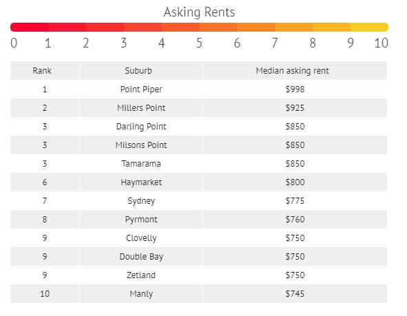 此外,市中心的Haymarket、CBD、Manly和Pyrmont,以及华人聚居区Zetland也位居前10,其中Haymarket周租金高达800澳元,CBD的周租金为775澳元,而Zetland公寓的周租金为750澳元。