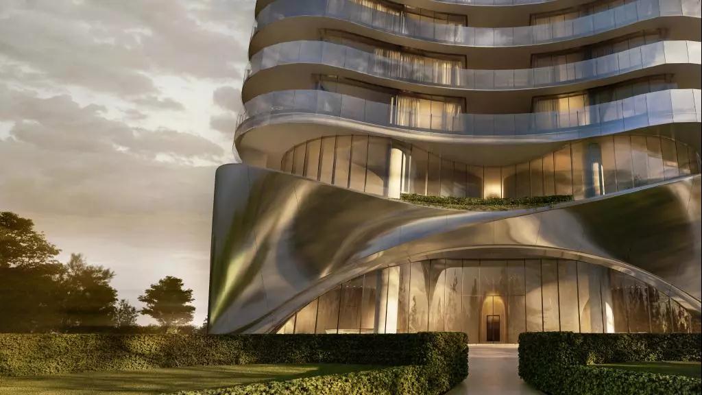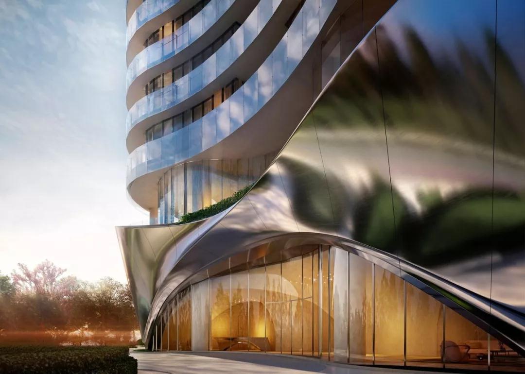 这栋公寓楼是Sunland集团与Contreras Earl 建筑合作的作品,由Contreras Earl建筑构思并设计,从建筑沿海的地理位置汲取灵感;其有机的弧线外立面采用了阳极电镀铝,流畅的线条就像是海风吹过沙滩留下的痕。“树篱基底”是一个供居民使用的两层楼,作为整栋建筑的公共区域,同时,3至44层的内部设计由开发商 Sunland Group完成。