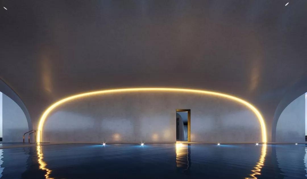 这栋公寓楼底层的内部像是岩洞一般,内部拱形自然而有力。凝灰石材质从室外一直延伸到室内,给空间的变化带来平缓流畅的衔接。天花板与内墙融为一体,形成天然完整的拱形空间。位于一层的泳池同样有着洞穴般的形态,天花板微微倒映着空间的弧线和水的波纹,通透的落地窗则展示了室外美丽的景观。