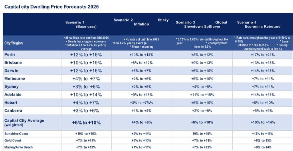 “我们多个情境预测显示,珀斯、布里斯班和阿德莱德在各种情况下都具备实现双位数增长的潜力,主要因其供应受限与区域经济动能。”
