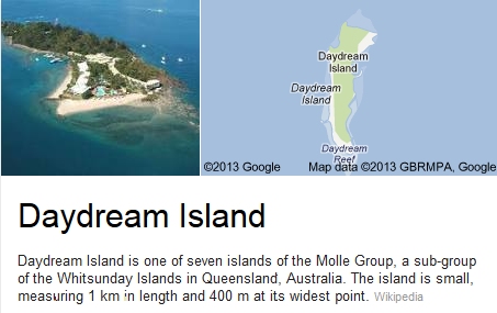 白日梦岛:白日梦岛是昆士兰圣灵群岛中的一个小岛,长1000米,宽400米,仅高于海平面51米。虽然岛不大,但是却旖旎多姿、曼妙无比,因活珊瑚礁而闻名。