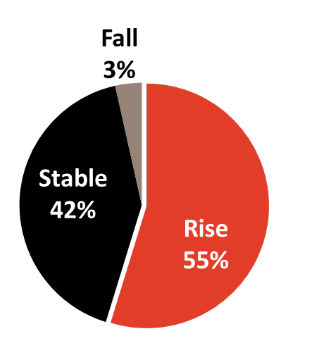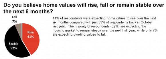 41%的受访者认为房价将上涨,相比去年10月份只有33%。大多数受访者(52%)预计房产市场将在接下来的6个月保持平稳状态,只有7%的人认为会跌价。