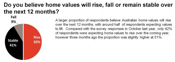 认为房价将上涨的受访者更多,几乎占受访者的一半。相比去年10月份只有42%预计房产市场将在接下来的12。然而3个月之前比重比现在稍大,为51%。