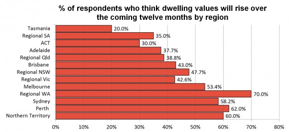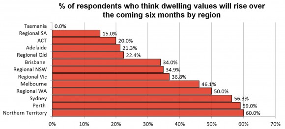 北领地(达尔文),珀斯和悉尼是预计上涨最旺的市场。相反,在塔斯马尼亚,南澳和首都特区鲜有人期待房产增值