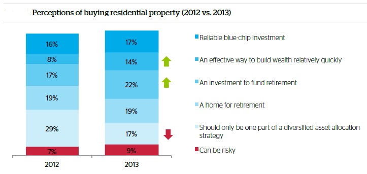 其他结果也同时指出物业投资的表现在未来几年会更出色,其中有17%的人将之视为“可靠的蓝筹投资”——相比2012年该人群占16%;14%的人认为这是创造财富的一条捷径(2012年8%),且有22%的人认为这是为将来退休生活准备的投资项目(2012年为19%)。