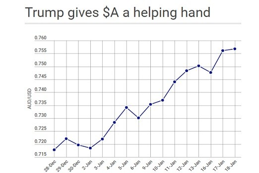 1月12日,特朗普召开新闻发布会。发布会之前,澳元对美元的汇率停留在73.75美分。