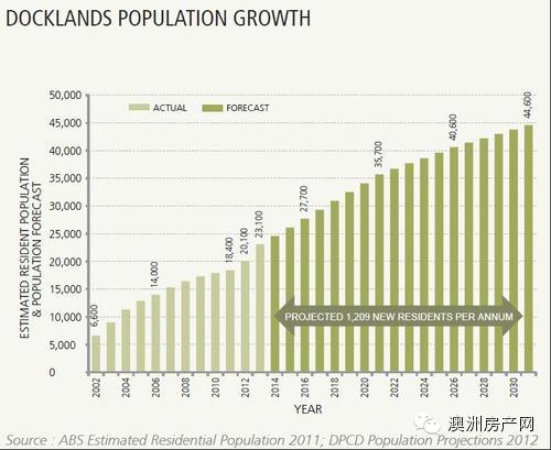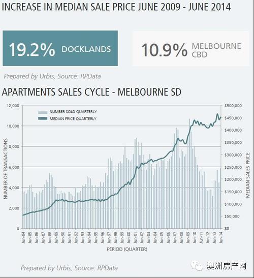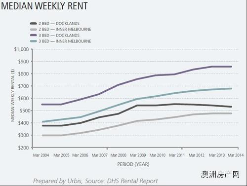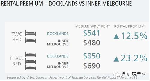 在2014年3月,Docklands的公寓也为投资者带来了12.5%(两间卧室)和23.2%(三间卧室)的租金溢价。
