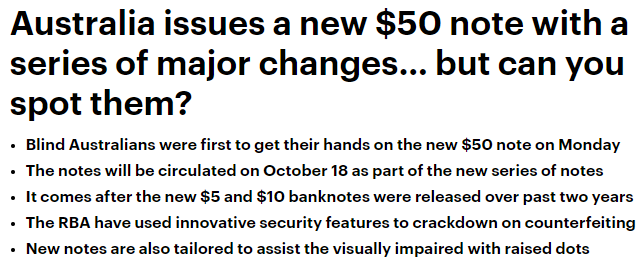 澳洲储备银行发言人Lindsay Boulton表示“因为50刀是市面上运用最广泛的面值,并且也是最容易被伪造的面值,所以改版是必须的”