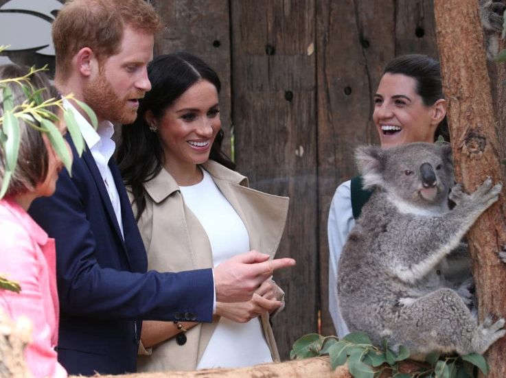 在新州州长贝瑞吉克莲(Gladys Berejiklian)与园方工作人员的陪同下,梅根和哈里王子来到考拉园区,抚摸两只考拉。它们的幼崽被命名为梅根和哈里,以作为当地民众送给他们的新婚贺礼。