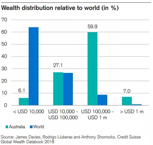 ▲ 澳大利亚人(绿色)与全球(蓝色)的财富分配比例:只有6.1%的澳大利亚人净资产低于10,000美元,而59.9%的澳大利亚人净资产在100,000美元-1,000,000美元之间;