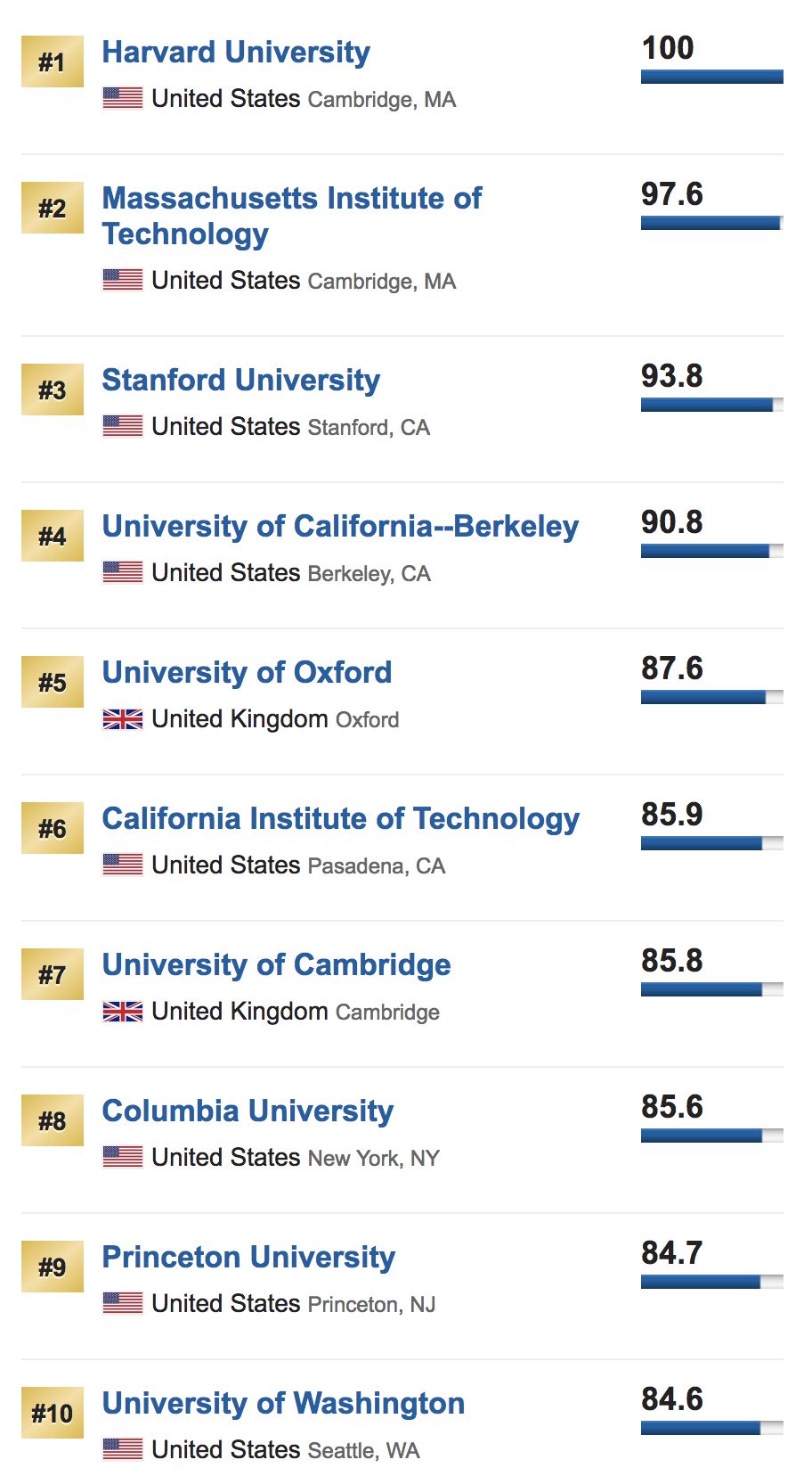哈佛依然蝉联第一,MIT依然第二,前十院校中除了牛津、剑桥之外,其余依然全部是美国大学!