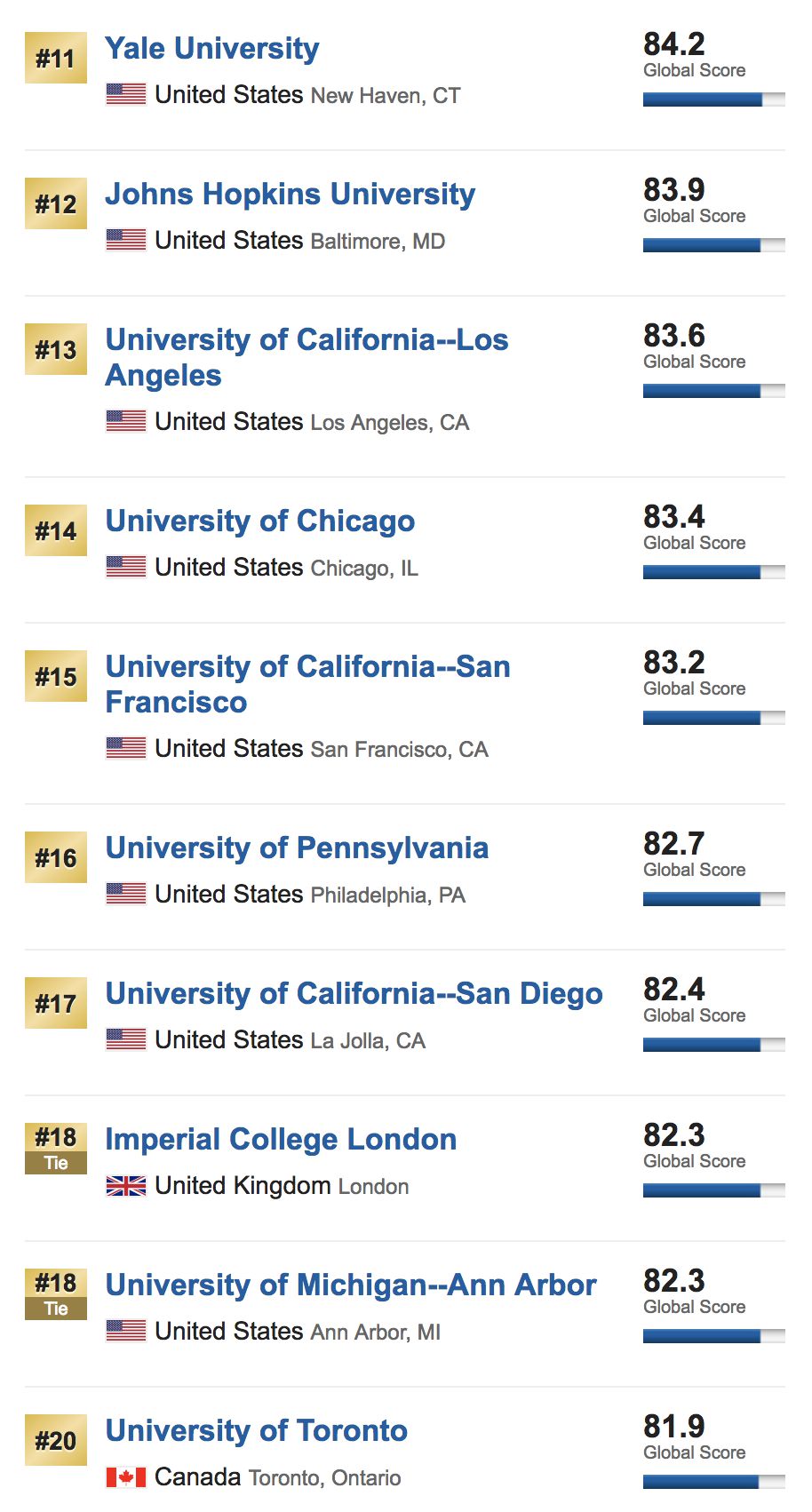 而在前二十中,加拿大多伦多大学及英国帝国理工学院也成功成为10-20中唯二非美国大学。