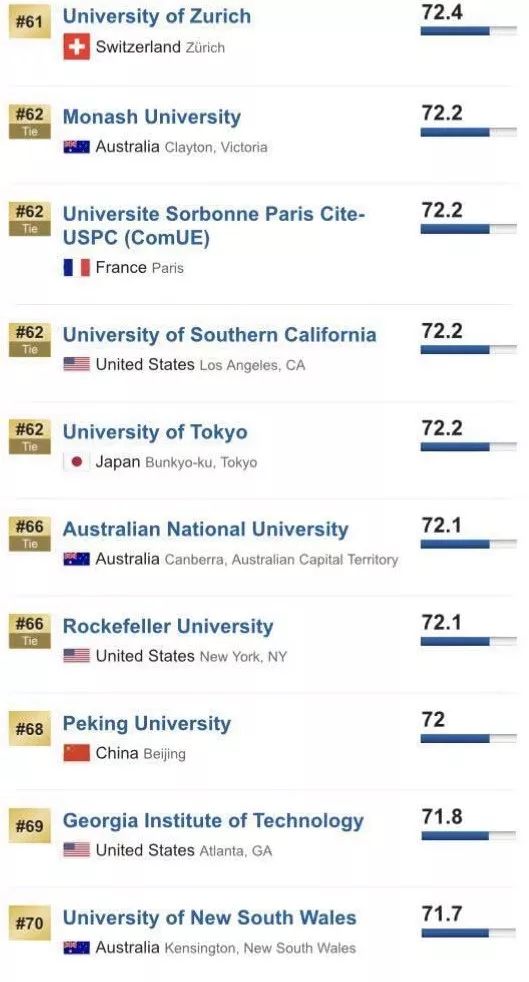 清华大学50,比去年提升14个名次,北京大学68,下降了3个名次,也是中国仅有的两所进入世界前百强的大学。