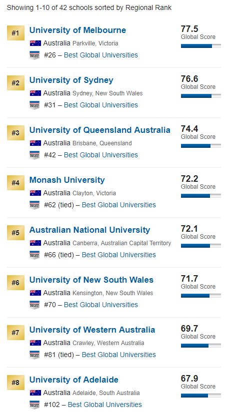 除了墨尔本大学排名未变,新南威尔士大学排名下降1位以外,其他澳洲八大名次都出现了不同程度的提升。