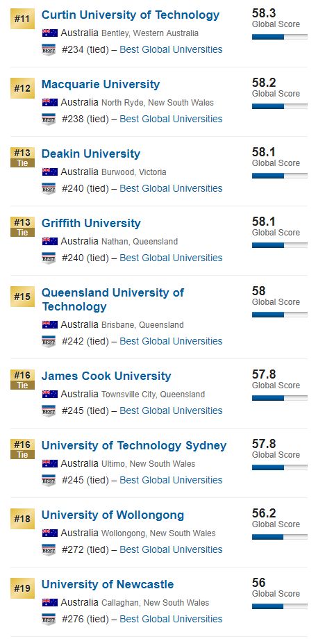 非八大,悉尼科技大学、麦考瑞大学、迪肯大学、格里菲斯大学昆士兰科技大学、詹姆斯库克大学、悉尼科技大学、卧龙岗大学及纽卡斯尔大学成为最大赢家,都杀入了前300,进步迅速!