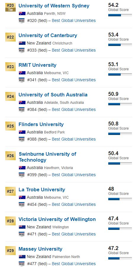 那么,澳新地区表现亮眼的前100大学为: