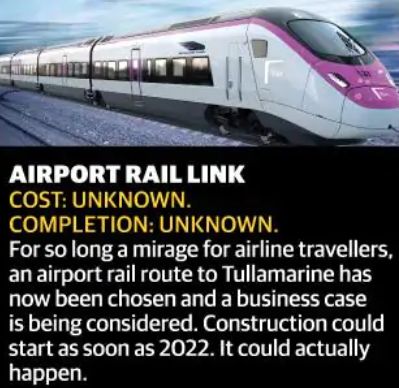 墨尔本机场铁路连线澳洲联邦政府维州政府合作共同规划建设的,当时的总理曾经表态:关于这条铁路曾有过无数的评估、报告、建议,但最终墨尔本人民等了这么多年也没等来它的影子。