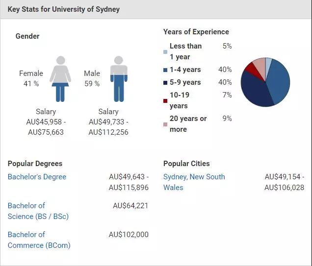悉尼大学毕业生薪资标准在$45958-$112,256之间,绝大多数毕业生都选择了留在悉尼本地工作。