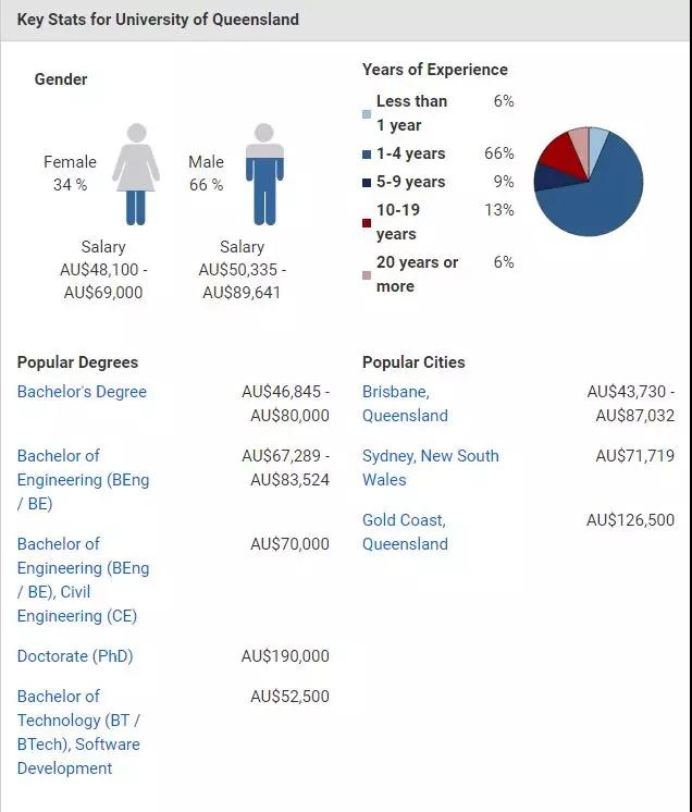 昆士兰大学在男女薪资表现上比较平均,差异不像其他高校那样明显。 另外,在黄金海岸工作的昆大毕业生们薪资水平非常可观,高达$126,500!
