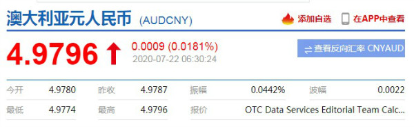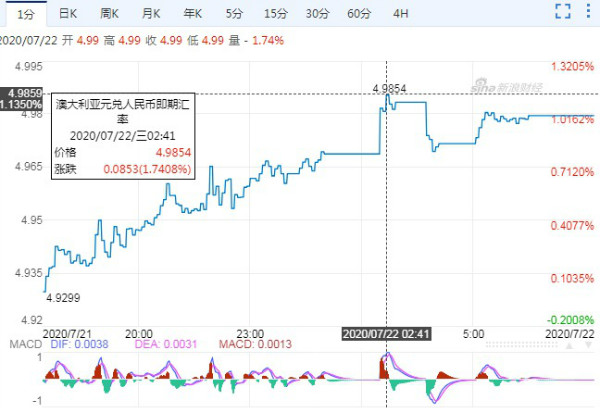 北京时间今日凌晨2点41分,澳元汇率强势走高,达到了4.9854,创下了近一年的最高位!