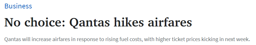 就在上个月,澳航发布了一份市场报告,报告中警告称,如果燃油价格继续攀升,它将不得不调整票价。