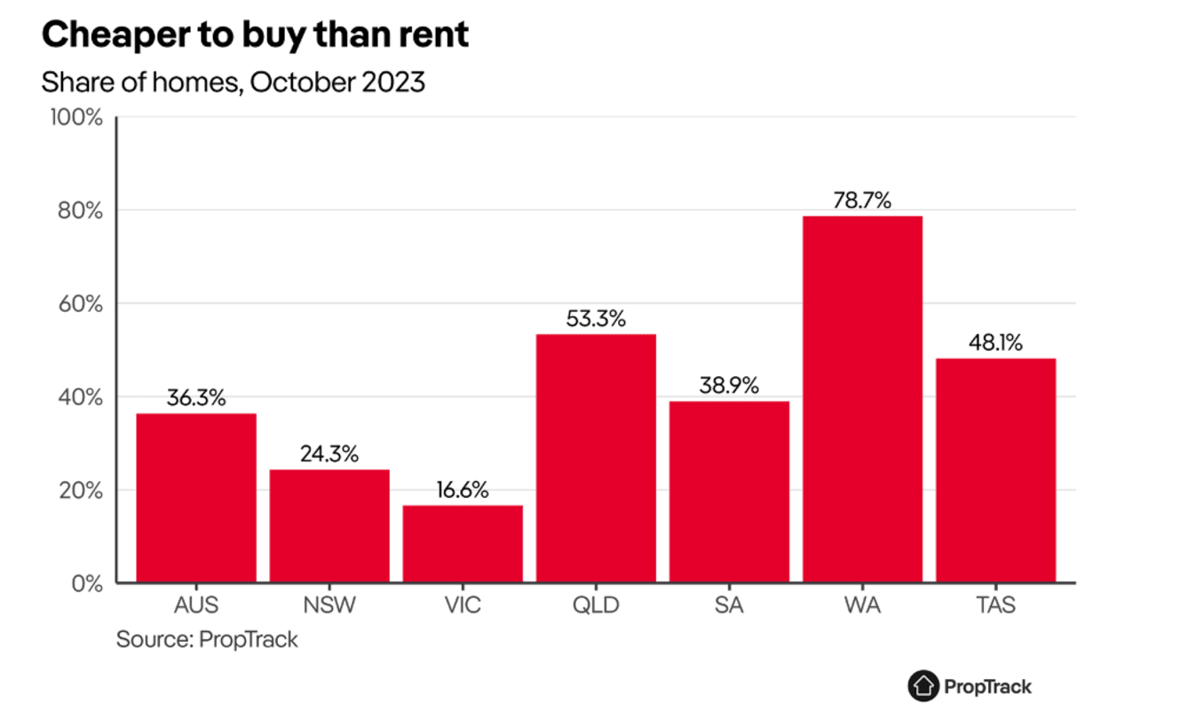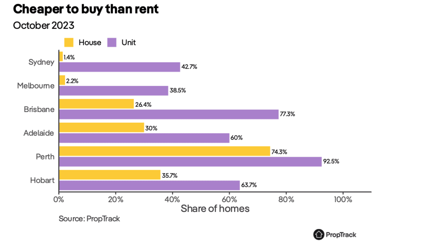 PropTrack 对财务成本和回报的综合分析显示,全国超过三分之一的房屋的购买成本比租金便宜。