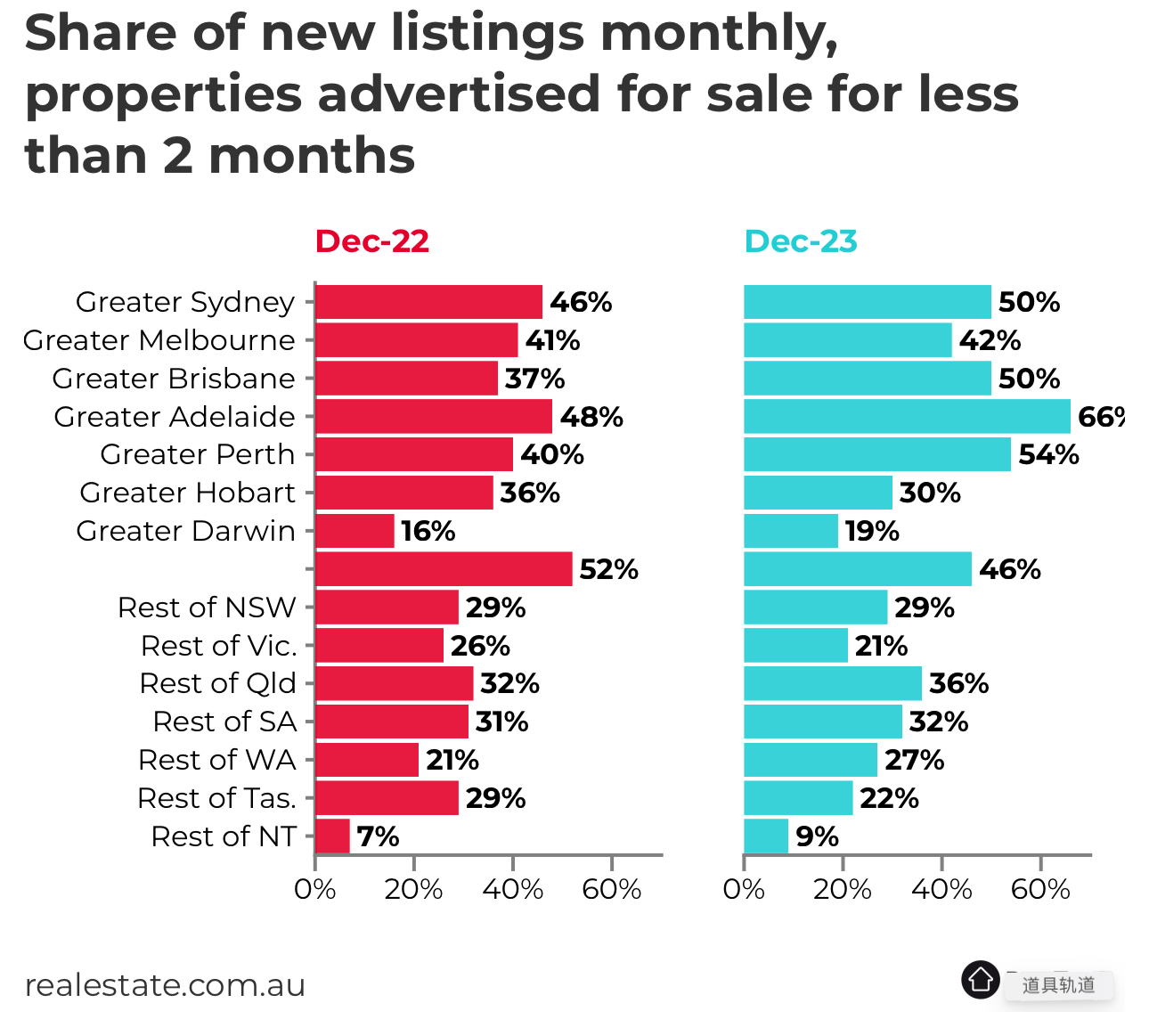 阿德莱德是目前该国最热门的市场,2023年12月有66%的新上市在60天或更短时间内上市,比2022年12月增长了37%。