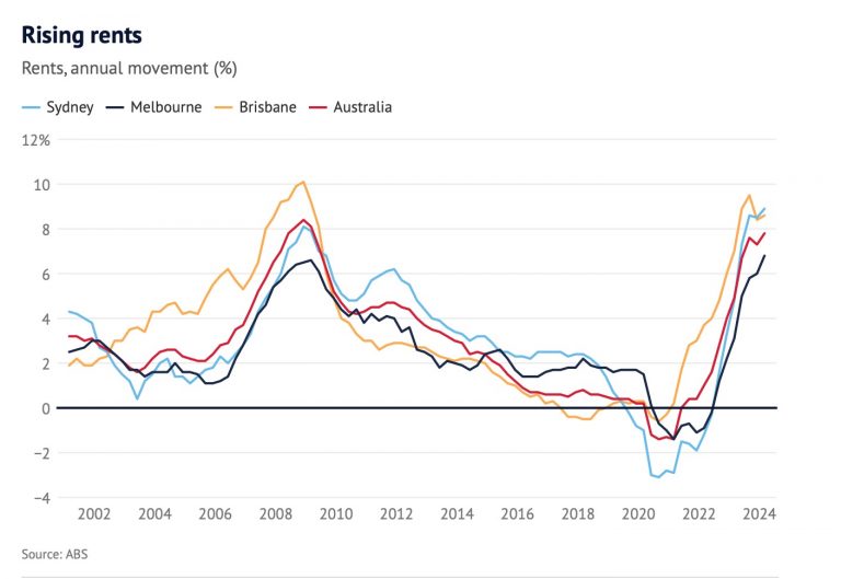 该公司的首席经济学家卡乔(Carlos Cacho)说,租金要价与澳洲统计局(ABS)的租金通胀数据之间存在大约18个月的滞后期,而租金通胀数据是所有租金的平均值,他说,广告租金的增长率约为10%,预计今年将保持在8.5%的高水平,2025年将放缓至4.3%。