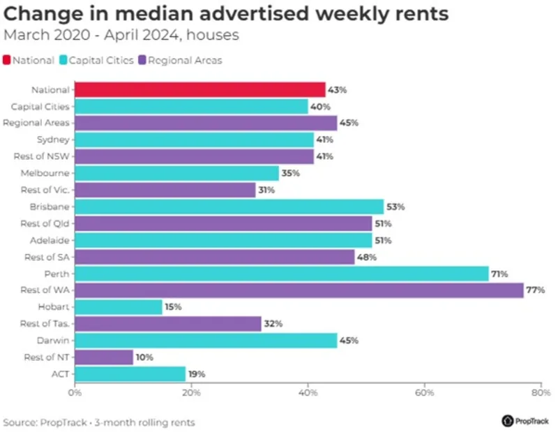 但有些市场的每周平均租金自 2020 年 3 月以来已飙升近 80%,其中昆士兰州和西澳大利亚州的首府城市和地区增幅最为强劲。