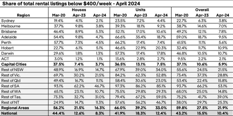 鉴于疫情爆发以来租金普遍上涨,每周租金低于 400 澳元的房屋份额减少也就不足为奇了。
