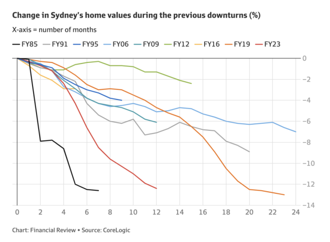 CoreLogic的分析显示,悉尼最近的一次低迷是由2022-23年的快速加息引发的,持续了12个月,房屋价值花了15个月才出现名义上的复苏。