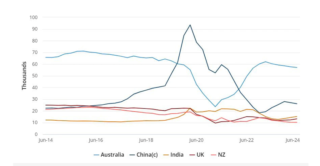自新冠疫情以来,唯一持续离开澳洲的主要人口群体是出生于澳洲的公民,仅在2023-2024年,就有57,100人离开澳洲,而回国的约有35,590人。