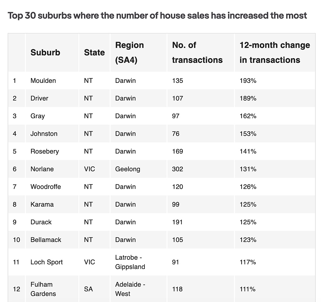 PropTrack最新数据显示,部分区过去一年的房产成交量较前12个月增长高达两倍。