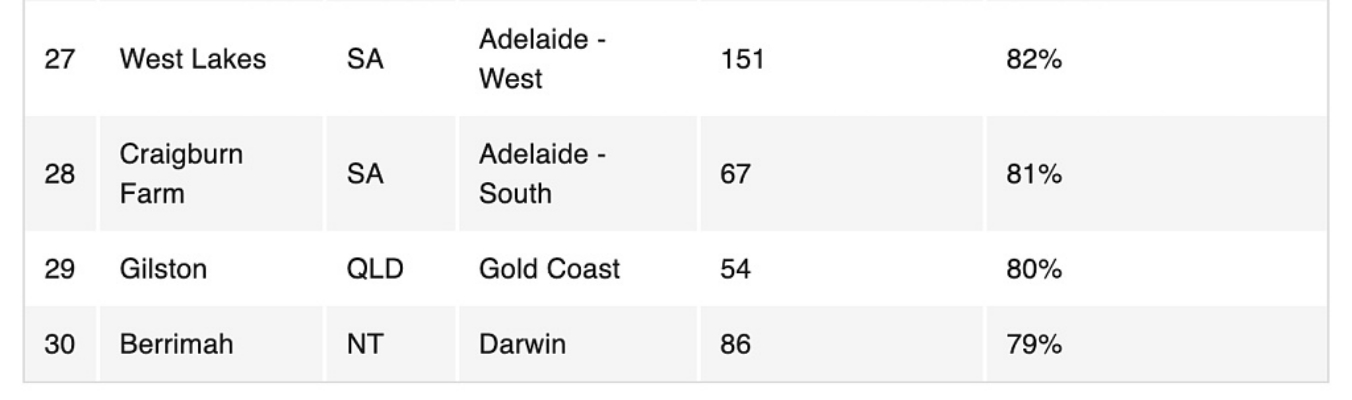 阿德莱德多个区的成交量也出现显著增长,其中Fuham Gardens(上涨111%)、Prospect(上涨102%)、Plympton(上涨92%)和WestLakes(上涨81%)表现亮眼。