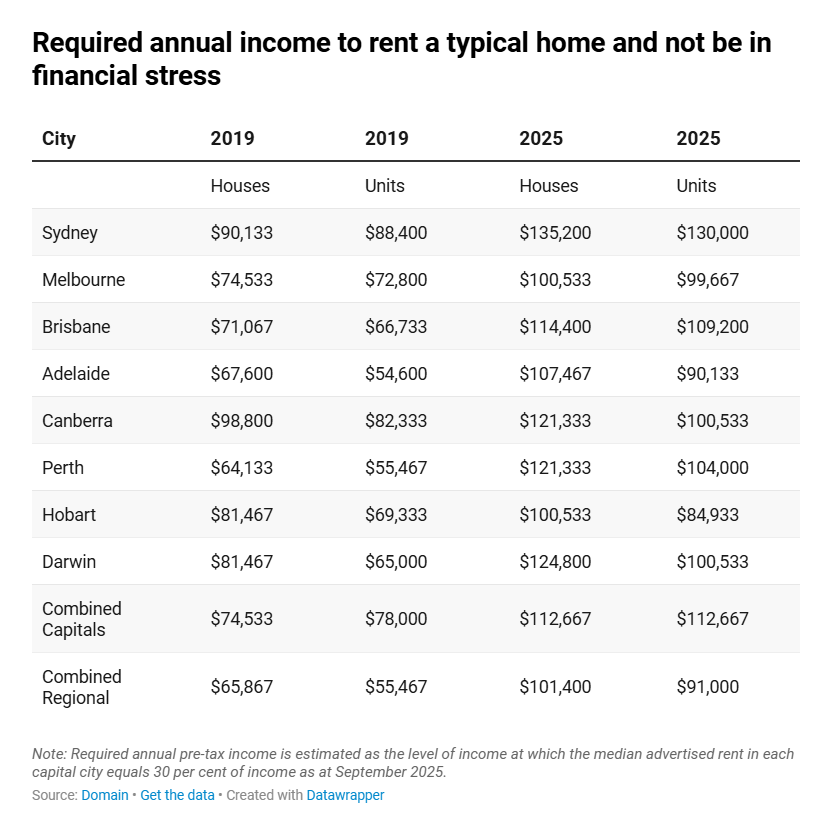 根据 Domain 的最新分析,租房者需要年收入达到六位数才能在澳大利亚任何一个首府城市舒适地租到房子。
