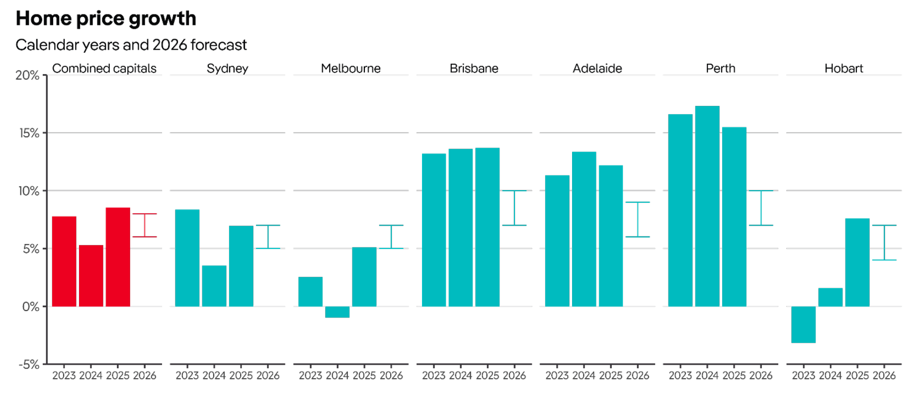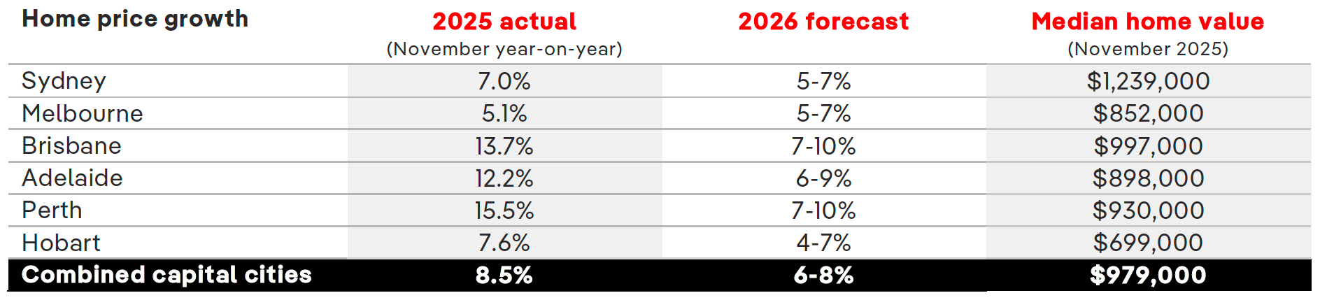 预计到 2026 年,房地产市场将达到新高,一些首府城市的房价涨幅将达到两位数,即使澳大利亚储备银行不再进一步降息。