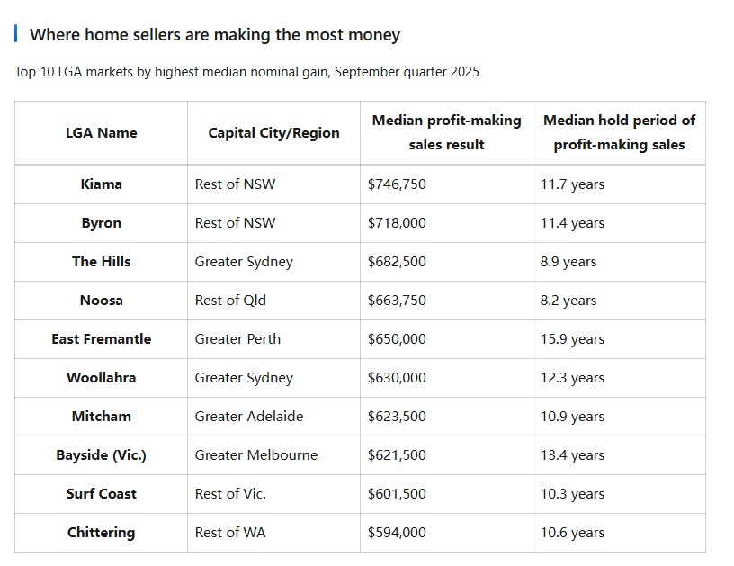 Cotality 的研究显示,新南威尔士州南海岸的基亚马镇(Kiama)在今年三季度全澳地方政府区域(LGA)卖房者名义利润排名中位居榜首,中位利润达 74.675 万澳元。