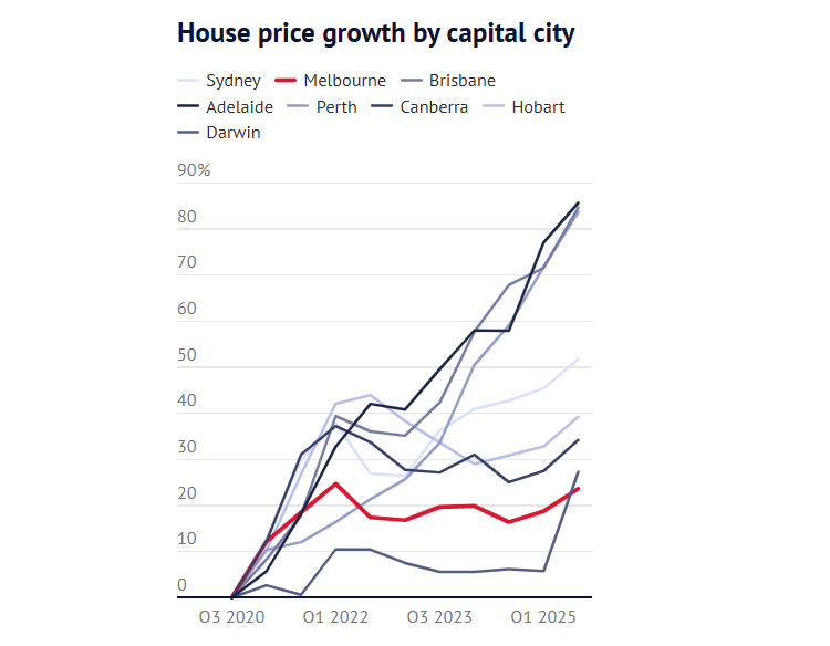 与此同时,自2020年以来,阿德莱德、珀斯和布里斯班的房价上涨了80%以上。