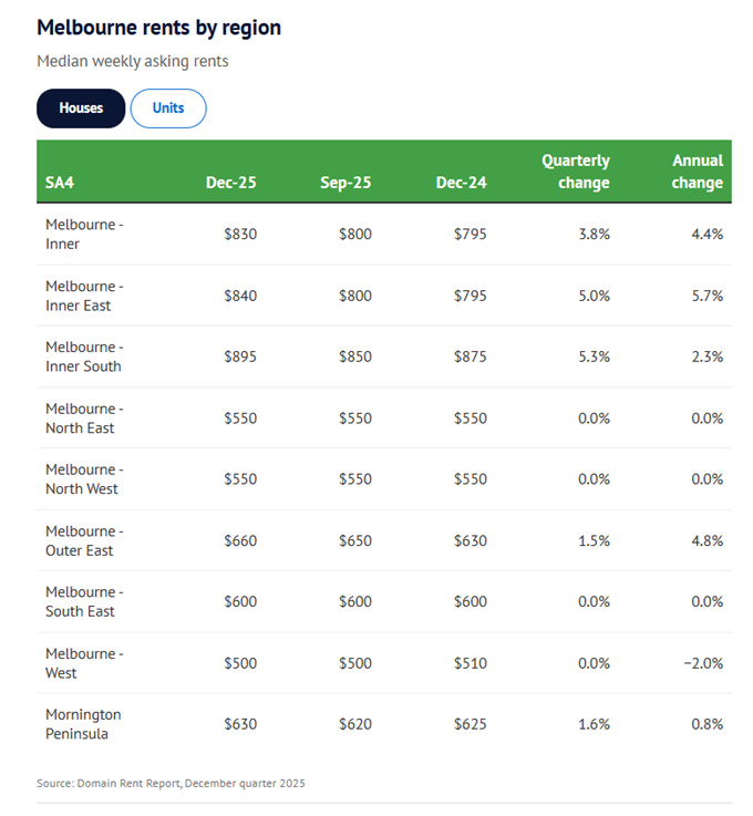 过去一年中增长最强劲的地区是墨尔本的东区,那里的房屋租金上涨了 5.7%,达到每周 840 澳元的中位数,公寓租金上涨了 6.4%,达到每周 585 澳元。