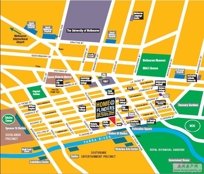 坐落于最具竞争力的墨尔本市中心地段,毗邻著名的金色弗林德斯火车站,四通八达的便利交通,无论您的出行选择电车或巴士均可到达城市的每个角落。地处雅拉河北岸的中心位置,一个充满书卷气息的区域,步行可至墨尔本知名学府:RMIT理工大学和维多利亚大学,距墨尔本大学仅2公里。墨尔本博物馆、图书馆及展览中心均可感受墨尔本艺术之都的气息。近距离可达墨尔本最大的女王超级市场,并与唐人街为邻,给亚洲留学生带来衣食住行的全面便利。