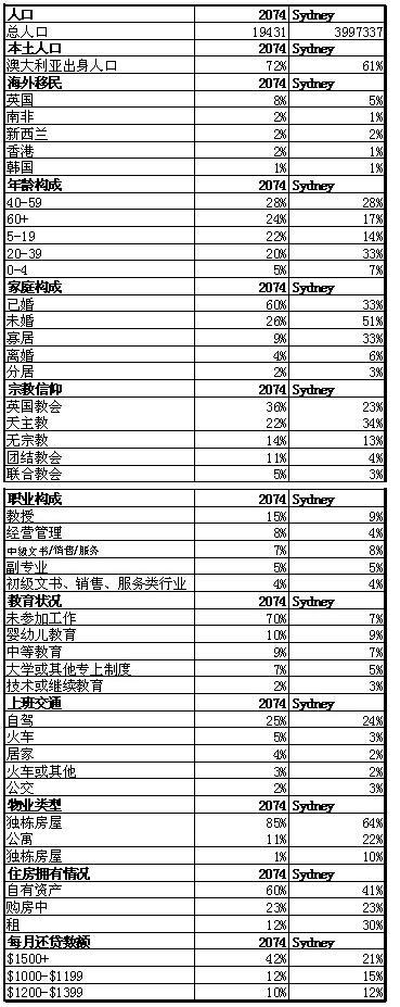 注意:该人口统计表依据最常见到最不常见进行排名,并将该目标地区与悉尼市得数据对比列出,以方便读者进行比较。本数据来源于澳洲统计局和澳洲房产研究监督所,版权归属澳大利亚联邦政府。英文版来源于www.domain.com.au