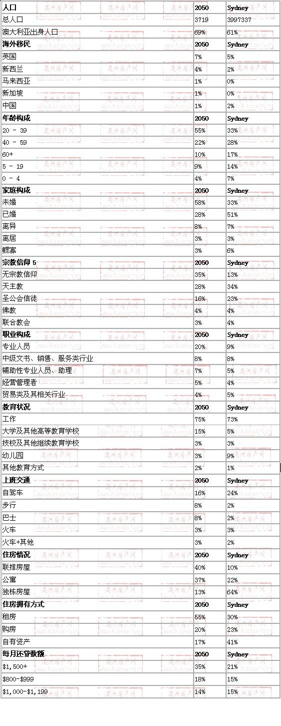 注意:该人口统计表依据最常见到最不常见进行排名,并将该目标地区与悉尼市得数据对比列出,以方便读者进行比较。本数据来源于澳洲统计局和澳洲房产研究监督所,版权归属澳大利亚联邦政府。英文版来源于www.domain.com.au