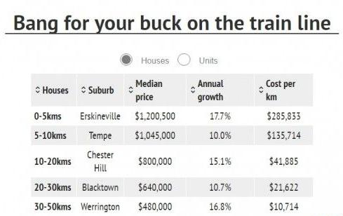 在距悉尼市中心5公里之内的火车站中,Erskineville 火车站附近的独门独院房,或Newtown 附近的公寓房是上佳选择。其每公里房价分别是285,833澳元和146,341澳元。
