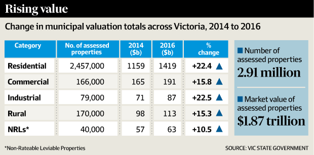包括公寓在内的住宅地产占据了2016年估值的大部分。其中,维州住宅地产的总价值上涨了22.4%至14亿澳元。在过去两年住宅地产估值每年上涨9%。最高涨幅的地区为墨尔本的东部:Monash,Whitehorse,Manningham和Maroondah市政地区两年的估值跳涨了30%。其中monash市政地区(包括Chadstone、Glen Waverley、Mount Waverley、Oakleigh和Burwood一部分)的估值飙升了39%。而商业地产的估值,主要集中在CBD地区和内城区,在过去两年有14%至20%的增长。