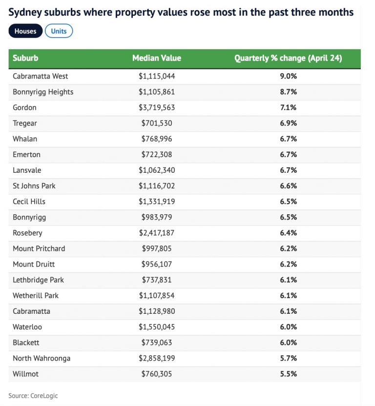 紧随其后的是悉尼西南的其他郊区,包括Bonnyrigg Heights(上涨8.7%)、Lansvale(上涨6.7%)、St Johns Park(上涨6.6%)和Cecil Hills(上涨6.5%),这些郊区的房价仍远低于悉尼市4月份142.1万澳元的房价中位数。