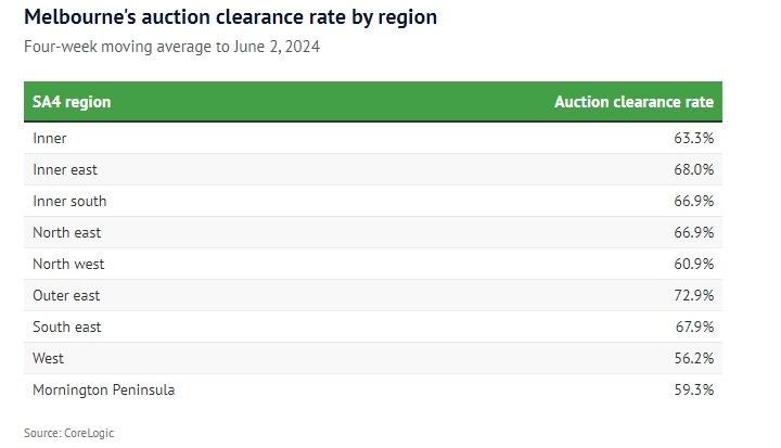 CoreLogic的数据显示,在截至6月2日的四周内,墨尔本的拍卖清盘率下滑至62.1%。清盘率是衡量有多少预定拍卖房产找到买家的指标,也是市场健康状况的一个指标。